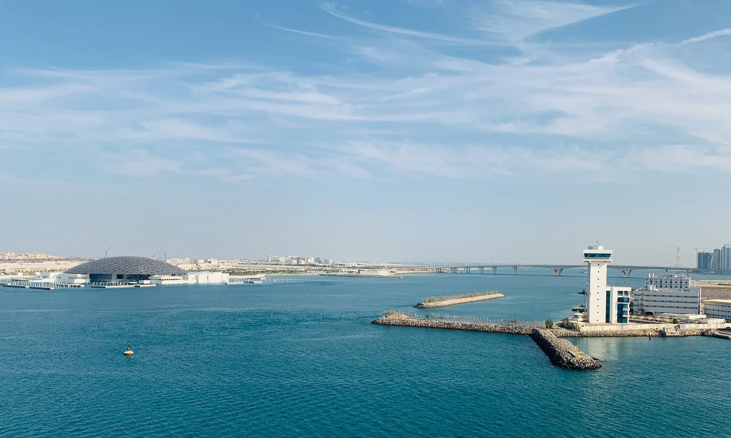 Saadiyat Island & the Abu Dhabi Louvre seen from the port with Yas Island in the distance