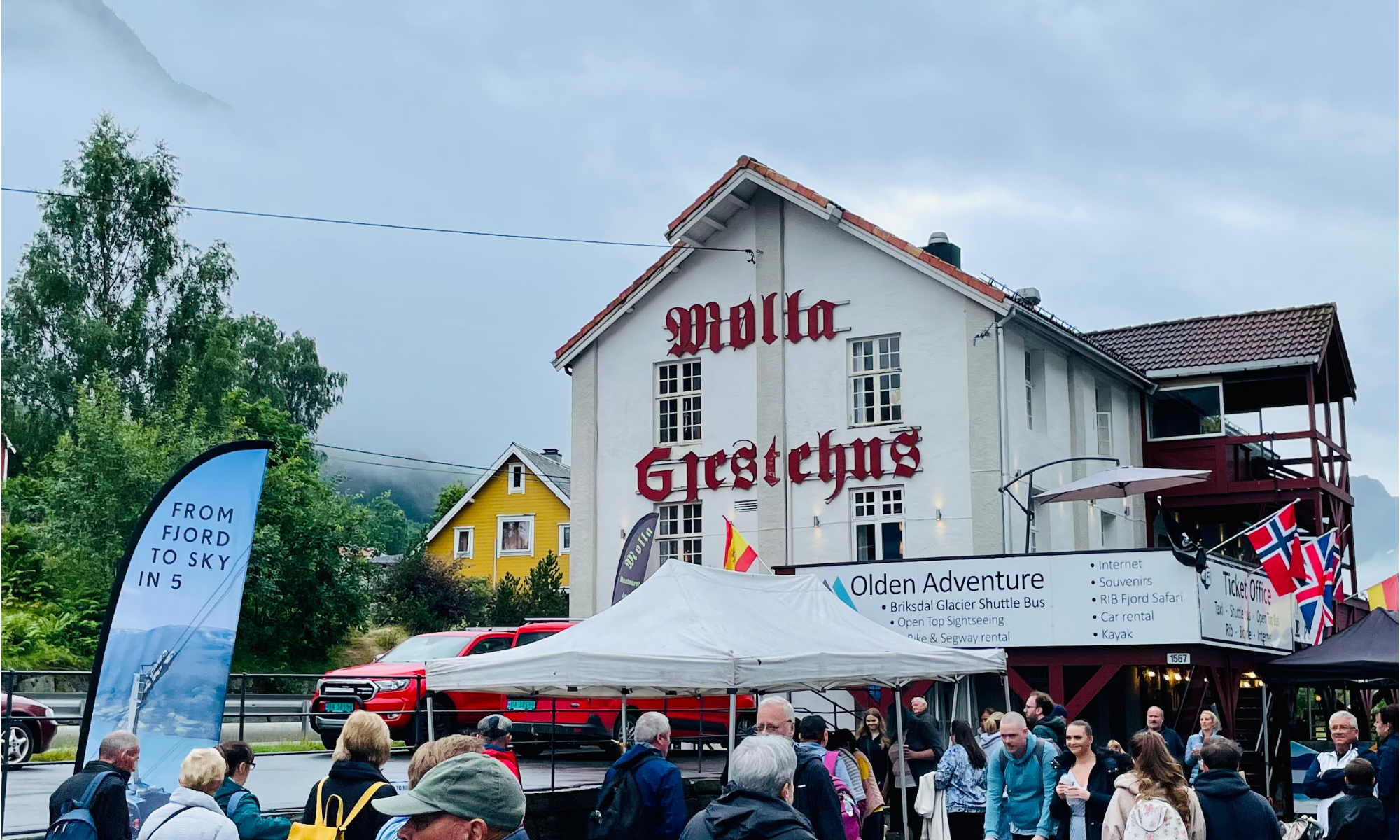 Tourist info: Olden Active at the dock acts as the main hub for cruise visitors, with maps, excursions, bike/kayak hire, and guided hikes.